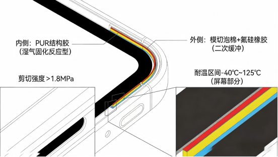 屏幕外圈与中框结合部位,采用双路径密封方案:内侧使用湿气固化反应型聚氨酯 PUR 结构胶,线形宽度控制在 0.8mm~1.2mm,固化后剪切强度>1.8MPa,耐温区间 – -40℃~125℃(仅指屏幕部分,非整机);外侧配合模切泡棉 + 氟硅橡胶二次缓冲,形成机械应力有效分散结构,降低跌落时玻璃与中框的应力集中风险。