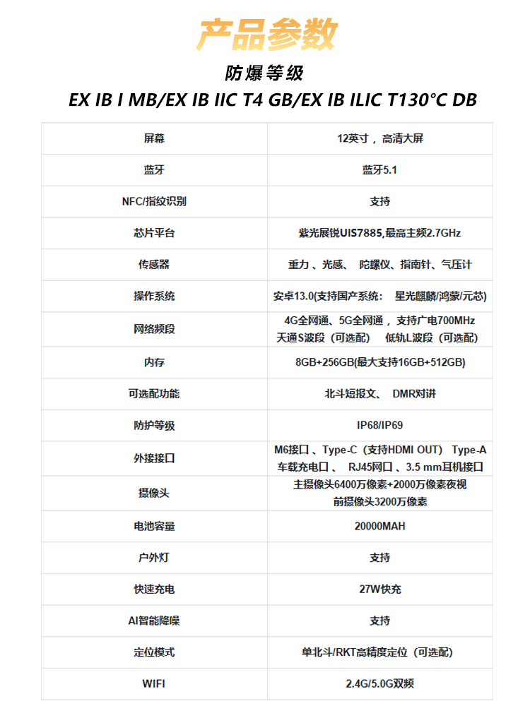 IP68级防尘防水;防爆认证:(EXIBIICT4 GB/EXIBD 21T130C)+宽温适配(-30C~+60C),耐寒、耐高温、防静电适用于石油化工、煤矿开采、应急救援、户外探险等多场景复杂环境。